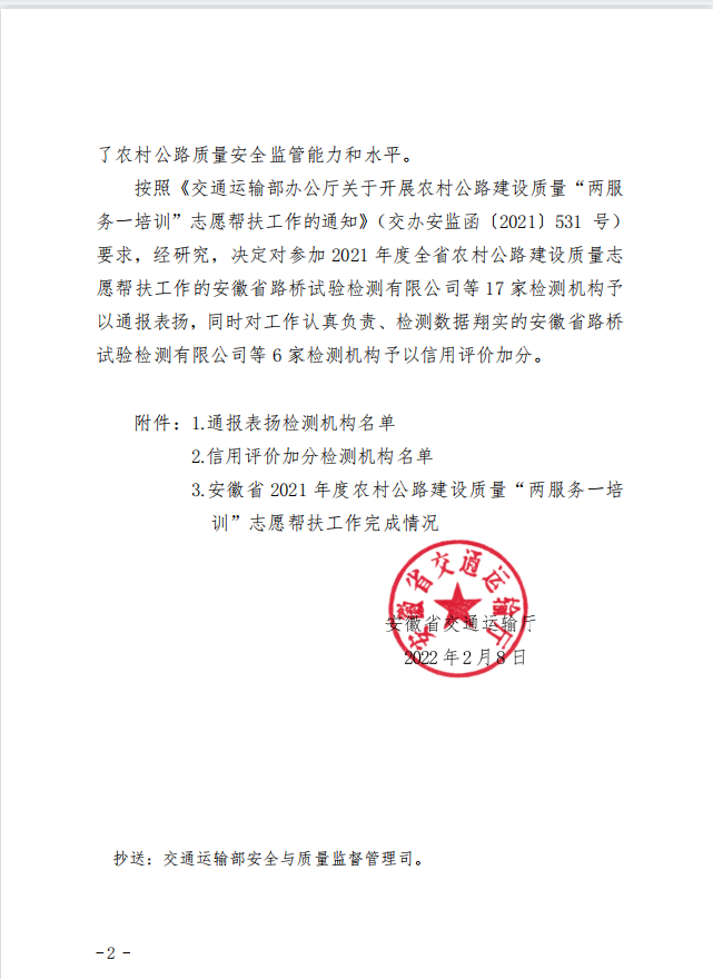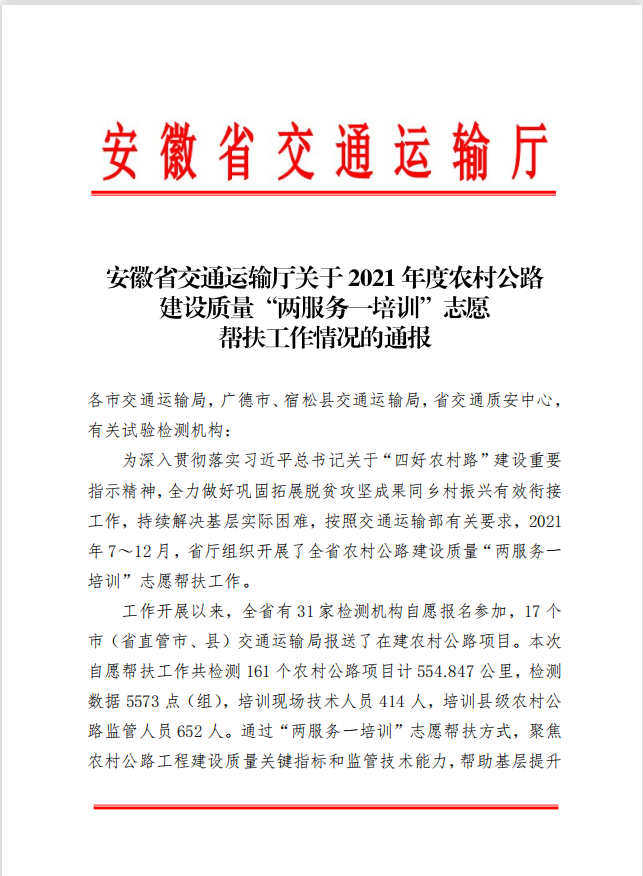 新年伊始,檢測中心即收到省交通運輸廳發(fā)來的通報表揚信,同時作為全省唯
